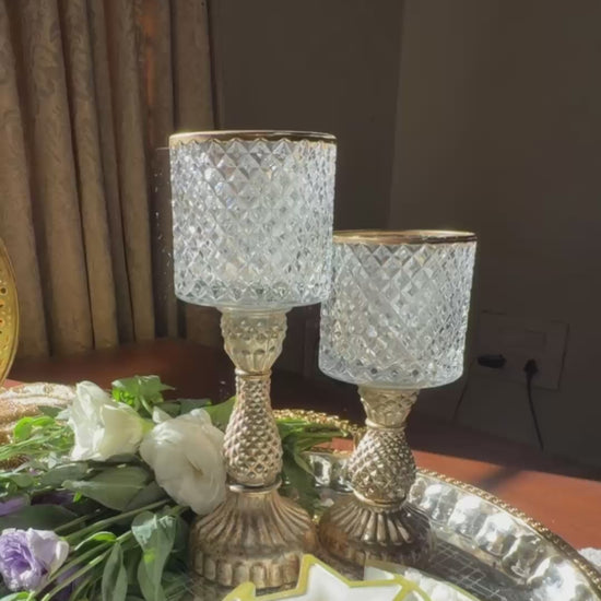 Elegant and timeless, this set of two glass hurricane candle stands is designed to bring a warm, graceful glow to your space. Crafted from clear glass and finished with an antique gold accent, each piece beautifully balances classic charm with understated luxury.