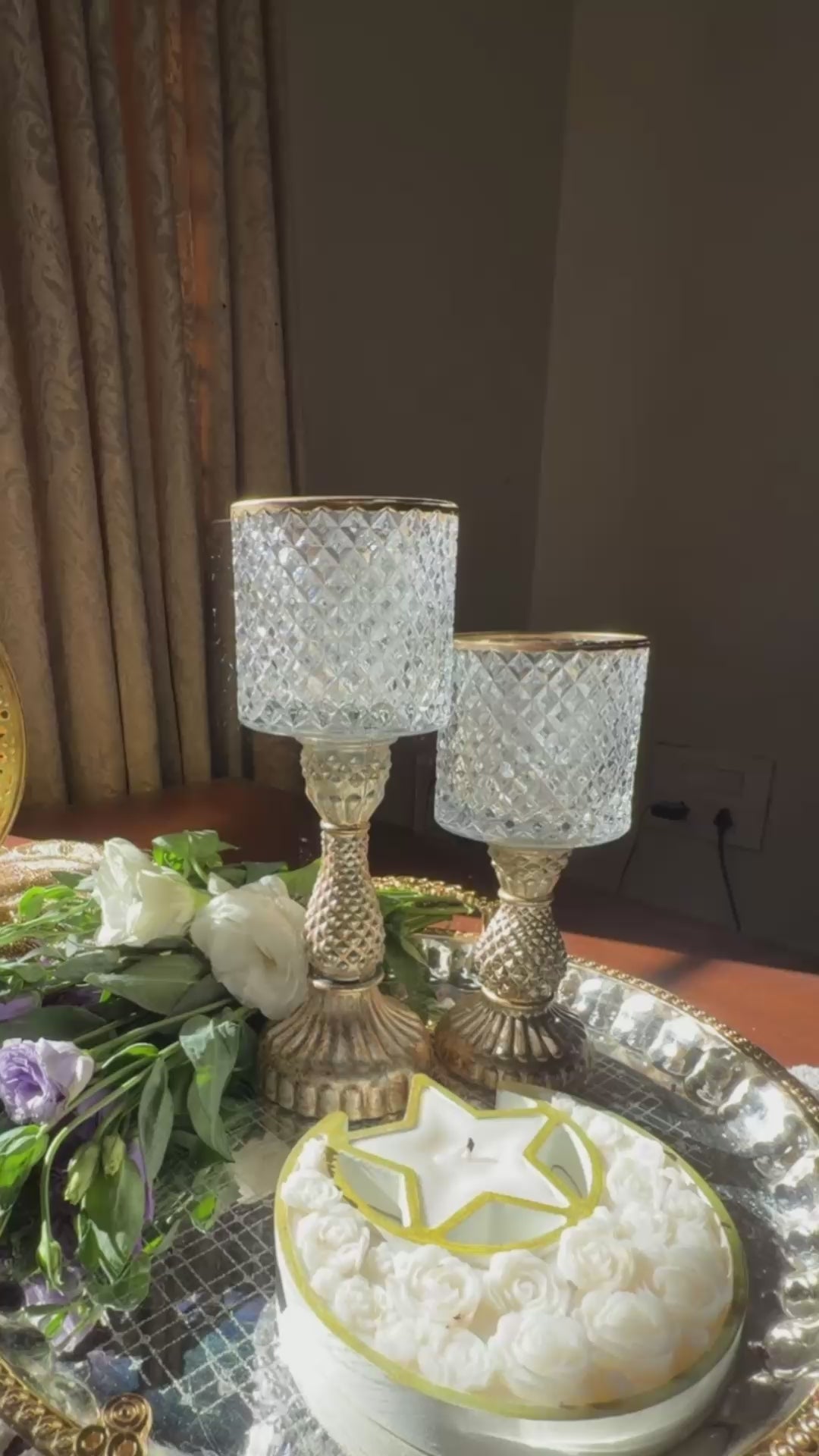 The set includes two sizes, allowing you to style them together for layered depth or separately to add soft illumination across your home. Perfect for Ramadan evenings, festive gatherings, or year-round décor, these hurricane stands cast a gentle, ambient light that elevates dining tables, consoles, and sacred corners alike.