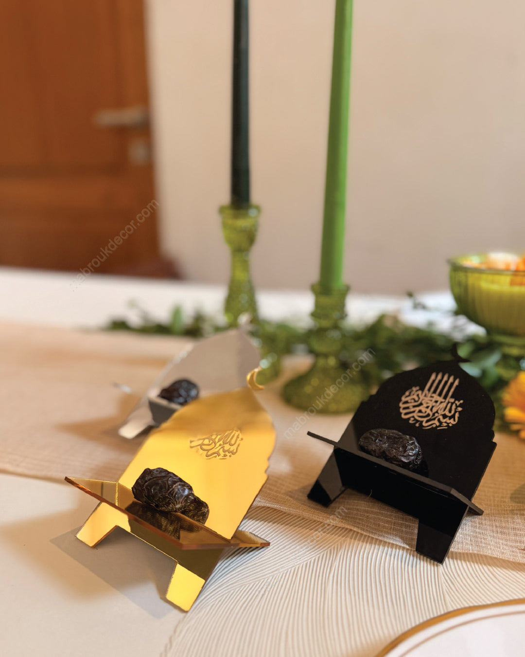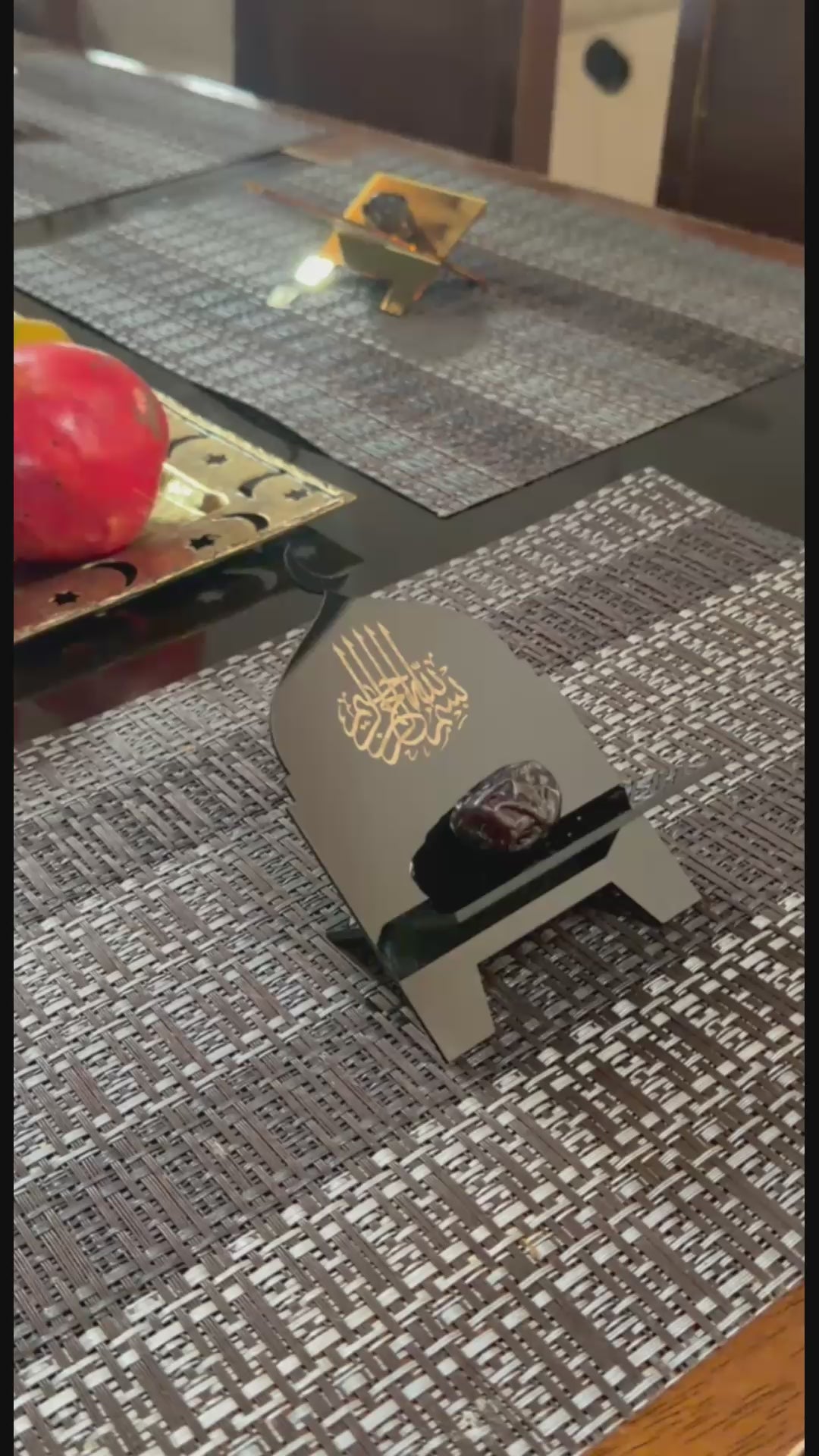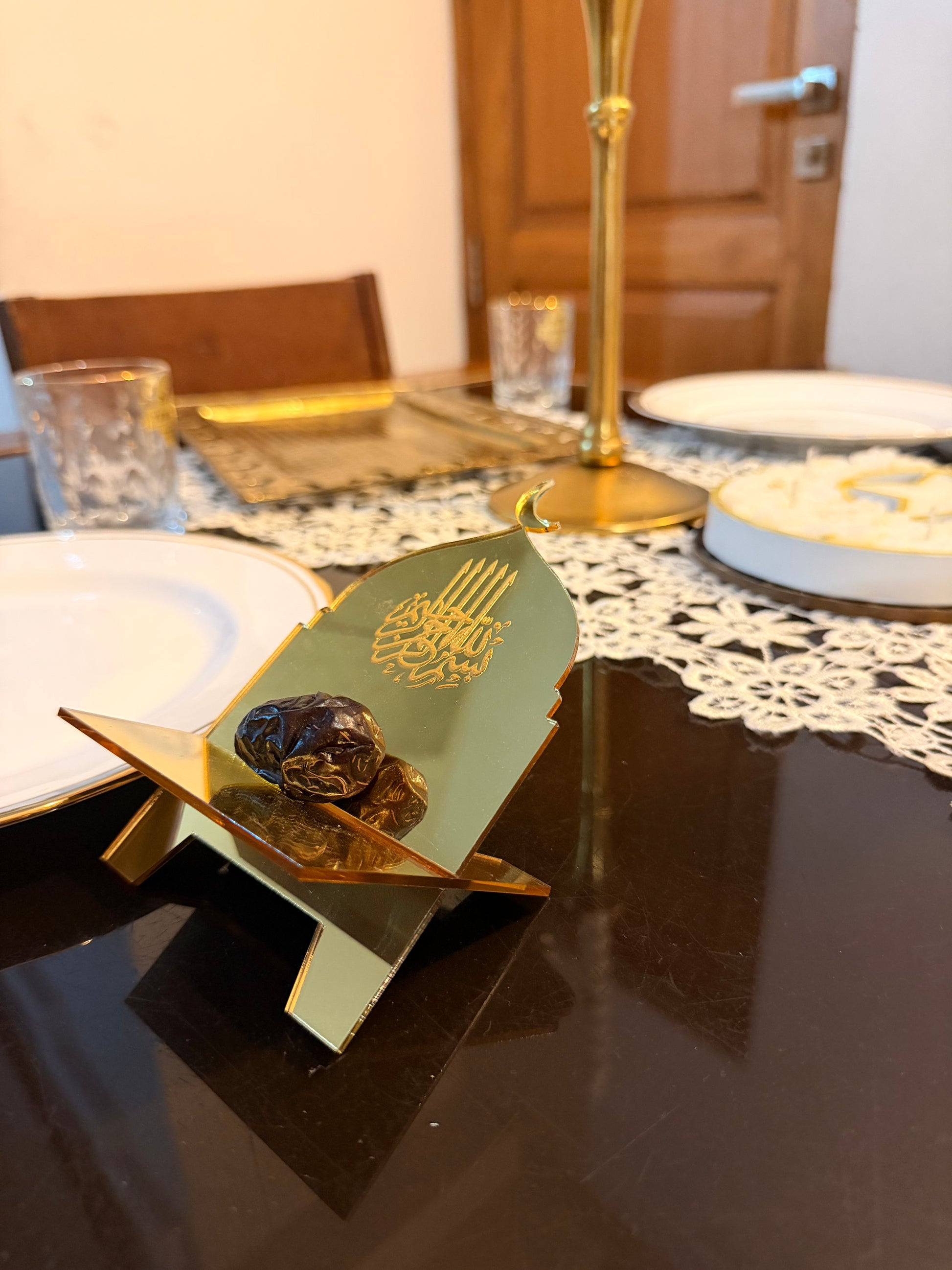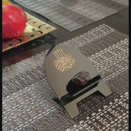 Thoughtfully designed for iftar tables, these small acrylic date holders bring together simplicity and symbolism. Shaped with a delicate crescent moon and adorned with Bismillah, they serve as a gentle reminder to begin every meal in remembrance and gratitude.