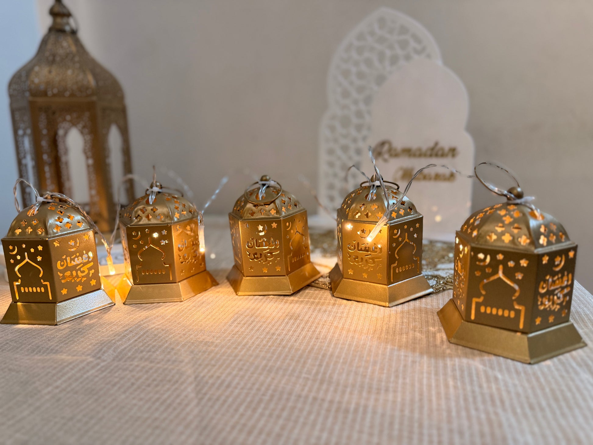 Each lantern is delicately crafted from high-quality metal, featuring intricate cutouts of mosques that pay homage to Islamic architecture. The golden hue adds a regal touch, while the soft glow of the LED lights creates a mesmerizing ambiance that is both inviting and serene.