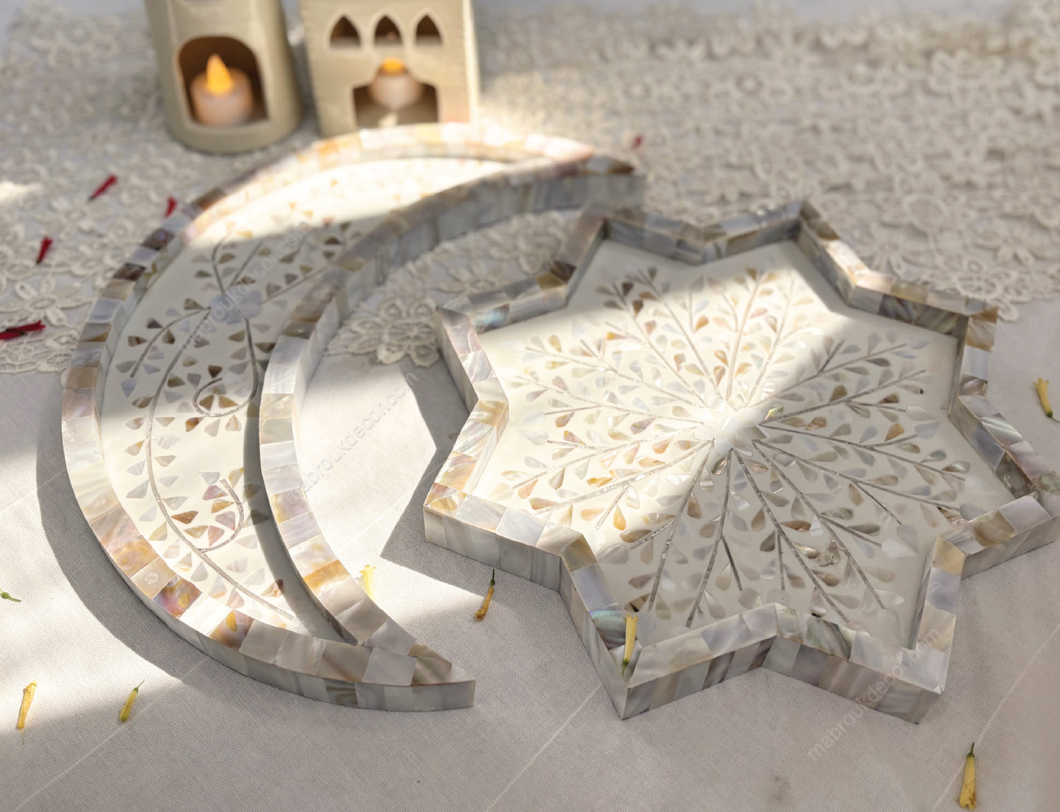 Celebrate the spirit of Ramadan with the Mother of Pearl Moon and Star Shaped Tray, an elegant addition to your festive decor and dining experience. Beautifully handcrafted, this tray is designed in the iconic shapes of the crescent moon and star, symbolizing faith and tradition. The radiant mother of pearl inlay enhances its luxurious appeal, making it a centerpiece of your Ramadan and Eid gatherings. Make it an essential addition to your Ramadan preparations and a keepsake for years to come.